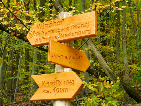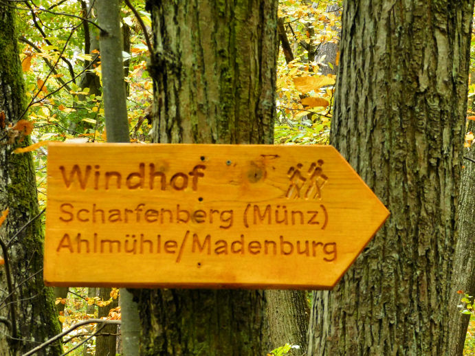 Angelangt am Knotenpunkt „Windhof“, direkt an der Trifelsstraße gelegen, muss sich der Wanderer entscheiden wohin ihn sein Weg nun führen soll: Richtung Rehberg, Madenburg, Leinsweiler, Ahlmühle, Burgruine Scharfenberg oder über Burgruine Anebos zum Trifels.