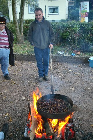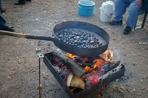 er röstete Kastanien in einer originellen Pfanne über dem offenen Feuer.