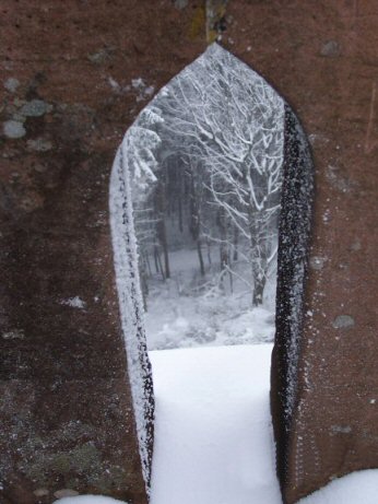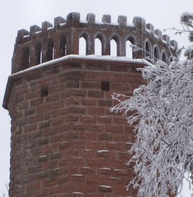 Über die verschneiten Stufen geht es ins Innere des Turmes.