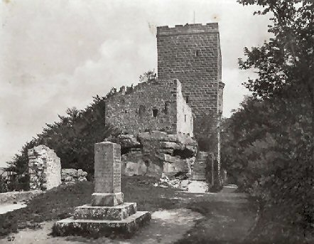 Auf der Südseite der Burg erhob sich in der Mitte des sogenannten Tanzplatzes eine von der Stadt Annweiler im Jahre 1854 errichtete Denksäule. Diese trug auf der Westseite die Inschrift: "Annweiler von dem schwäbischen Herzog Friedrich und dem Vater des Hohenstaufen Friedrich Barbarossa gegen das Dorf Morsbrunn in Unter Elsass eingetauscht 1116."
