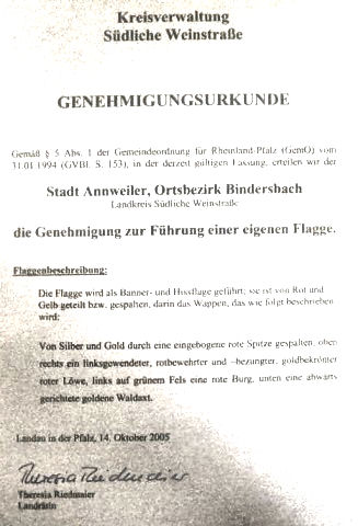 Am 8. Januar 2006, beim Neujahrsempfang der Stadt Annweiler am Trifels, überreichte Landrätin Theresia Riedmaier dem Bindersbacher Ortsvorsteher Franz Kaiser die Urkunde, welche Bindersbach berechtigt, fortan ein Wappen zu tragen.