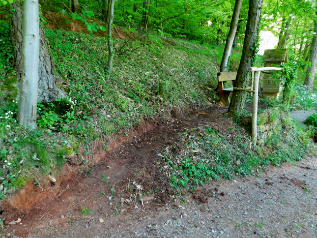 Auf der dem Bildstock gegenüber liegenden Wegseite fand eine grobe, aber gemütliche Holzbank ihren Platz. Wie viele Menschen mögen da wohl jahrzehntelang - mit Blick auf die Mutter Gottes und dem Jesuskind in ihren Armen - gesessen und gebetet haben? Irgendwann verfiel die Bank und wurde abgerissen. Das Gelände um das Standbild verwilderte mit den Jahren, Efeu überwucherte das Sandsteingemäuer. Im Frühjahr 2012 beschloss der Bindersbacher Brauchtum-Verein dem Bildstöckl wieder einen würdigen Rahmen zu verleihen. Selbst an eine Ruhebank wurde gedacht. Dieses Mal wurde sie allerdings auf einem kleinen Podest neben dem Bildstock platziert, um den Waldweg frei zu halten. Es entstand ein besinnlicher Ruhepunkt für Jung und Alt mit einem wunderschönen Blick auf das Kurhaus Trifels, den alten Ortskern von Bindersbach und den geschichtsträchtigen Trifels.